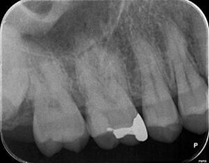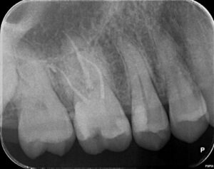 他院で治療をしてもらったが、痛みがずっと続く、ということで当院に来られました。診査の結果、右上6番目の歯の神経が細菌感染を起こしているため、痛みが続いているとわかりました。そこで、2回に分けて、根管治療と修復処置を行いました。