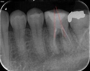 今回のケースも最小限の入り口から根管治療を行うのですが、Radix Entomolarisと呼ばれる歯根のところが難しいと予想しました。事前にCBCTを撮影して、シミュレーションを毎回行っています。あとは私が開発した方法を利用して入り口の大きさを決定しています。それが下のレントゲン写真です。